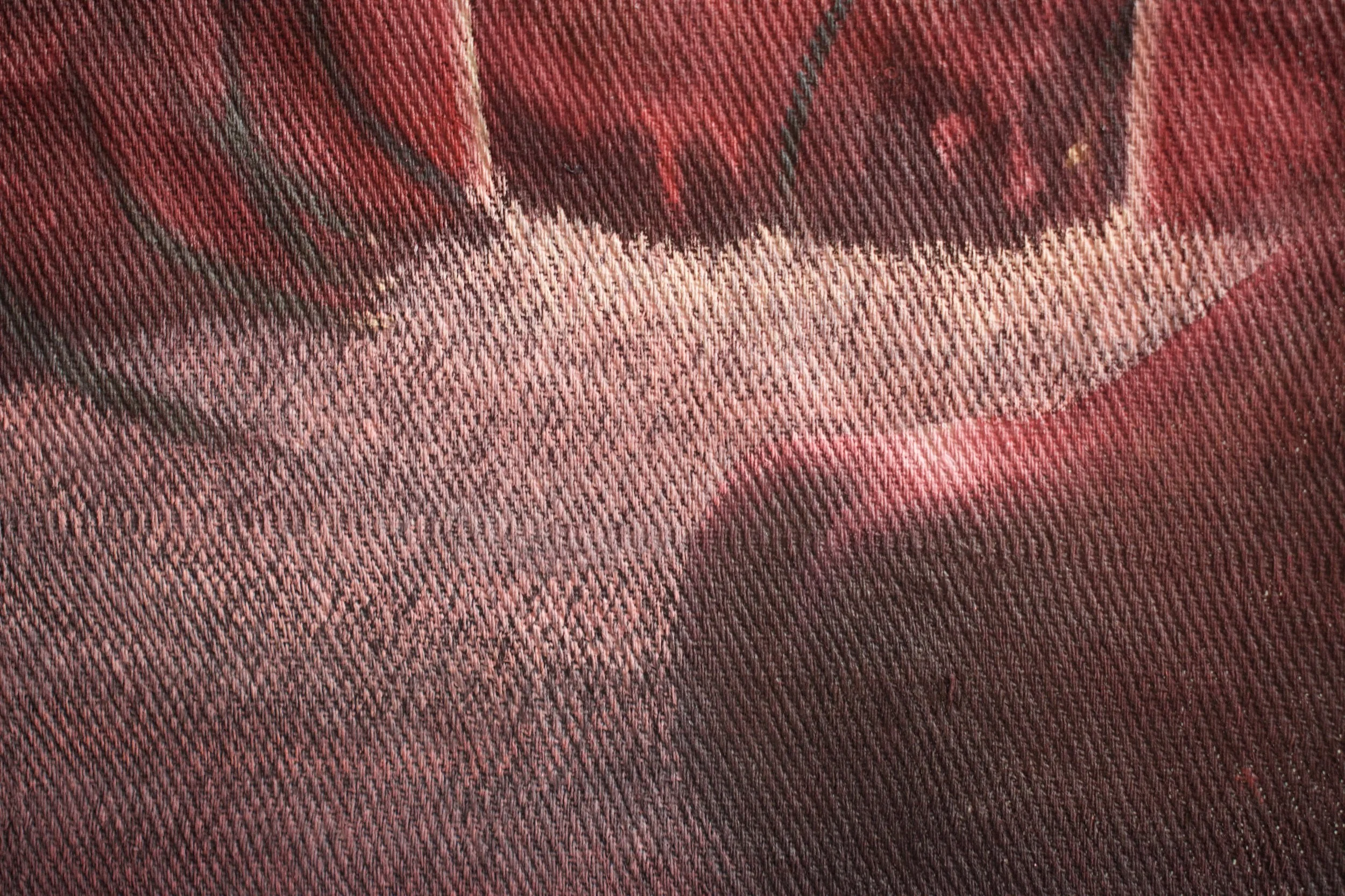 This piece is inspired by a photo taken walking back after a night out. Staying with a couple and walking behind them, this piece exaggerates the alone feeling. Using the unmounted canvas to and burn-like staining to create foggy memory effect.